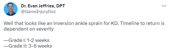 医学专家Evan Jeffries表示杜兰特脚踝扭伤,复出时间取决于受伤的严重程度,最轻一级扭伤,康复时间为1-2周;二级扭伤需要休养3-6周。