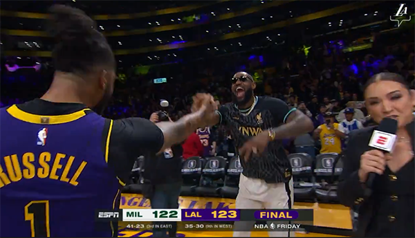 湖人1分险胜雄鹿赛后,詹姆斯咧嘴大笑十分兴奋,发出“鸭叫声”与拉塞尔击掌庆祝,还发推盛赞拉塞尔;目前湖人人35胜30负排在西部第9位,仅仅领先勇士0.5个胜场,根据赛程,湖人将在明天上午9点30分大战森林狼,詹姆斯有望复出。