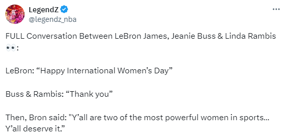 据美唇语专家解读,詹姆斯坐在两人中间祝贺她们:国际妇女节快乐;兰比斯摸着老詹的手臂表示:谢谢,谢谢;珍妮-巴斯直接靠在老詹的肩膀上;詹姆斯继续说:你们都是体育界最有权势的两位女性,你们应得的。