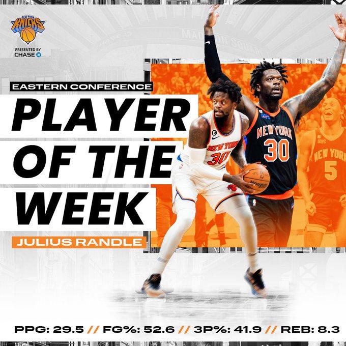 上周,尼克斯4胜0负,兰德尔场均29.5分8.3篮板4.8助攻。尼克斯官方晒图祝贺兰德尔当选周最佳。