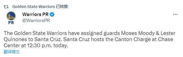 勇士官方宣布将摩西-穆迪与莱斯特-基诺内斯下放至发展联盟圣克鲁兹勇士;本赛季至今,穆迪已经为勇士打了50场比赛,场均得到4.6分1.6篮板。