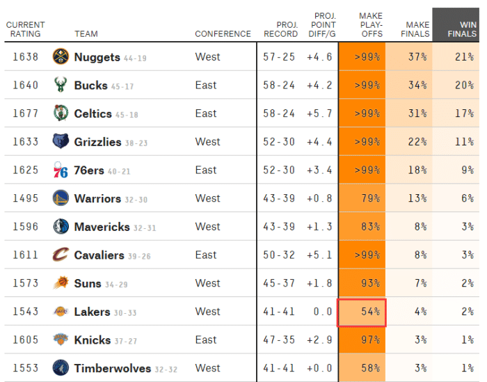 一文详解湖人现状:詹姆斯或常规赛报销 仍有54%概率重返季后赛