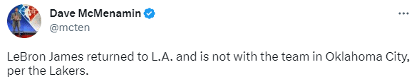 24直播网讯03月02日,詹姆斯、浓眉和拉塞尔三大主力都因伤缺战雷霆,据报道,詹姆斯已经提前返回洛杉矶,暂时离开球队,未随队前往俄城。