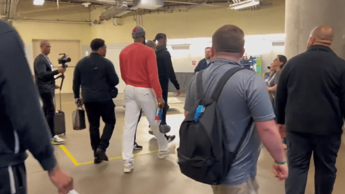 湖人赢球赛后,詹姆斯和浓眉一起离开球馆,老詹身穿白色长裤并且带着针织帽,提着保温杯,走路时一瘸一拐,有些令人担忧。