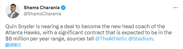 来源:24直播网02-25 10:1524直播网讯02月25日,据名记Shams报道,前爵士主教练斯奈德接近成为老鹰新主帅,年薪预计约800万美元,预计他将重拾教鞭,执教特雷-杨和穆雷带队冲击季后赛。