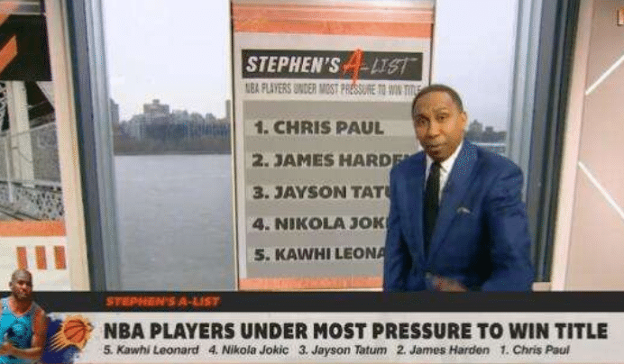 来源:24直播网02-23 15:0924直播网02月23日讯 ,NBA现役球员之中谁的夺冠压力最大?美名嘴斯蒂芬-A-史密斯在节目中,列出了他心目中夺冠压力最大的球员,在这份名单的球员有:克里斯-保罗、詹姆斯-哈登、杰森-塔特姆、尼古拉-约基奇和科怀-莱昂纳德。
