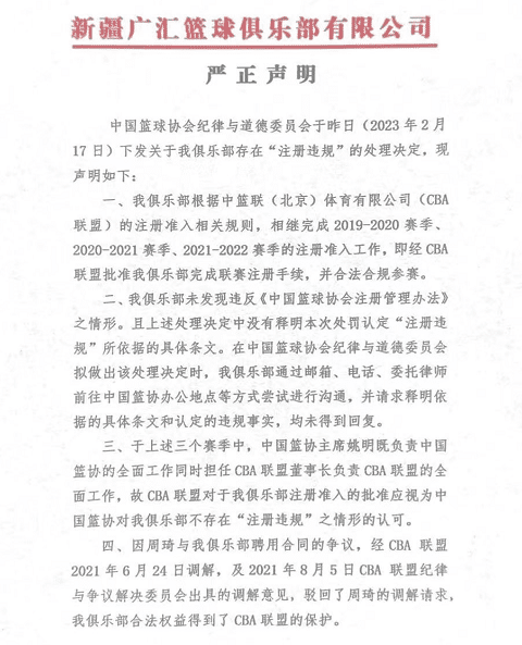 CBA公司:此前站在新疆男篮方面、驳回了周琦的调解请求。