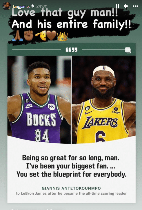 今天詹姆斯转发字母当面祝贺自己的视频,并且配文写道:天啊,我爱那个家伙!以及他的整个家庭!
