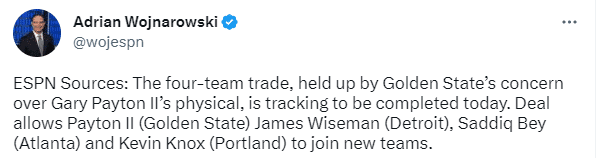 勇士把怀斯曼送到活塞,2个次轮签送到开拓者,最终得到小佩顿;老鹰送走三个次轮签,最终得到萨迪克-贝;活塞送走诺克斯和萨迪克-贝得到怀斯曼;开拓者送走小佩顿,最终得到5个次轮签和诺克斯。