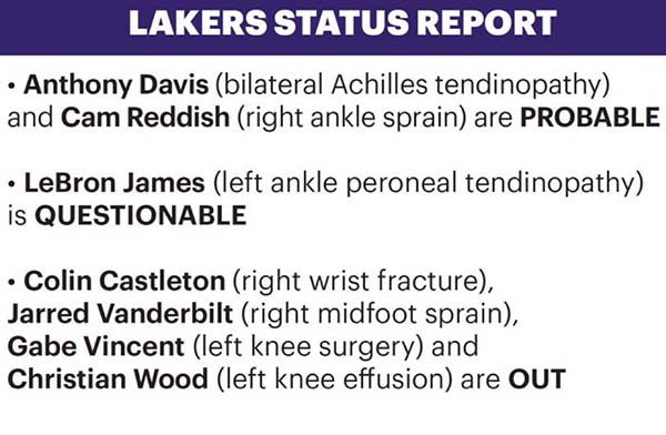 名记woj透露,只要脚踝伤势不加重,詹姆斯就会继续带伤出战;湖人官方已经公布下一场对阵雄鹿的伤病报告,浓眉(双侧跟腱炎)、雷迪什(右脚踝扭伤)大概率出战;詹姆斯(左脚踝腓侧肌腱炎)出战成疑;卡斯尔顿(右手腕骨折)、范德比尔特(右中足扭伤)、伍德(左膝积液)、文森特(左膝手术)都因伤休战。