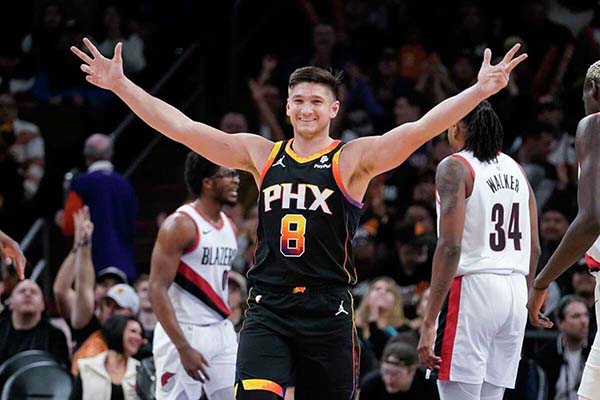 主场对阵猛龙,格雷森-阿伦开场三分球4中3,连中三分扛起太阳进攻大旗,随后阿伦延续滚烫手感,三分球怎么投都有,又连中4记三分球,首节打满12分钟,8投7中爆砍21分还有3篮板1助攻1盖帽,看到阿伦状态火热,杜兰特主动把球传给他,太阳球迷也期待阿伦继续投。