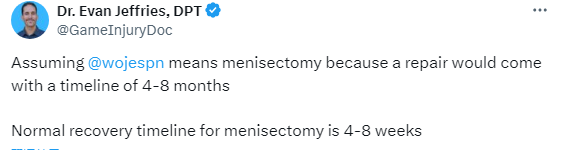 医学专家Evan Jeffries表示若接受半月板切除手术,一般需要4-8周的康复时间;若接受半月板完全修复手术,一般需要休战4-8个月。
