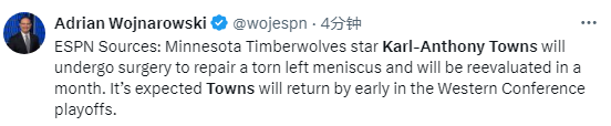 由于不幸遭遇左膝半月板撕裂的重伤,唐斯被列为无限期休战,听取专家的意见后,最终唐斯决定接受半月板修复手术,因伤至少休战一个月;换言之,从今天算起,唐斯至少伤停到4月8日,至少缺席接下来的15场比赛,而森林狼本赛季的常规赛将于4月15日结束。