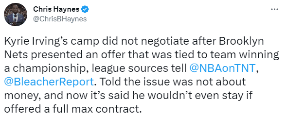 据露天看台记者Chris Haynes跟进报道,联盟数位消息人士表示,在篮网提出一份与球队夺得总冠军挂钩的续约报价之后,欧文的团队就再没和球队进行续约谈判了。这(欧文续约)不是钱的问题,现在还有人说,如果给欧文一份全额顶薪合同,他也不会留下来。