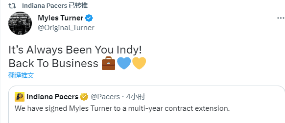 步行者官宣续约后,特纳发推写道:一直都是你,印第安纳!回到工作岗位之上。