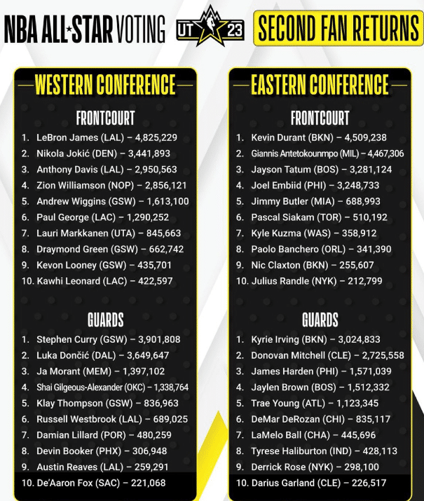 目前篮网的球员中,杜兰特目前位居东部前场第一,以450万票傲居东部所有球员的第一位,放眼联盟也仅次于482万的詹姆斯。欧文则是东部后场第一名,票数为302万,篮网两大核心,是很有可能在NBA全明星首发出战。