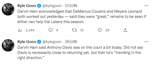 湖人已经试训了考辛斯和梅耶斯-莱昂纳德两大中锋,他们的试训表现很不错,能否加盟湖人还有待观察;其中考辛斯为了重返NBA而一周苦练六次;上赛季,考辛斯为雄鹿和掘金共出场48场,场均上场15分钟能够拿到9分和5.6篮板,失业期间,考辛斯曾表示愿意接受任何角色。