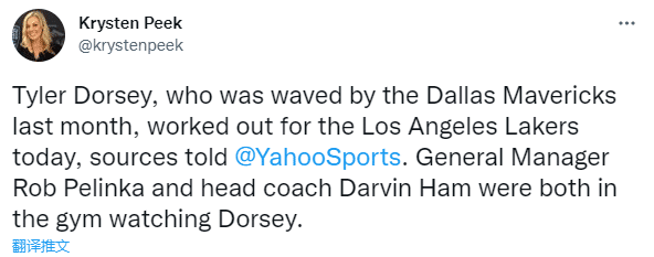 湖人伤病满营,他们已经计划用10天合同签约签约临时工,据NBA记者KrystenPeek报道,湖人今天试训了独行侠弃将泰勒-多西,湖人总经理罗勃-佩林卡和主帅达尔文-哈姆在球馆内观看了他的试训。