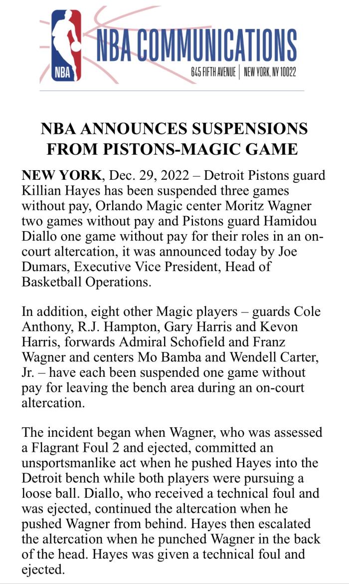 NBA官方公布了此前火爆冲突的吹罚结果,海斯禁赛三场,瓦格纳禁赛两场,迪亚洛、凯文-哈里斯、RJ汉普顿、斯科菲尔德、班巴、加里-哈里斯、科尔-安东尼、小温德尔-卡特禁赛一场,多名球员因离开替补席被禁赛。