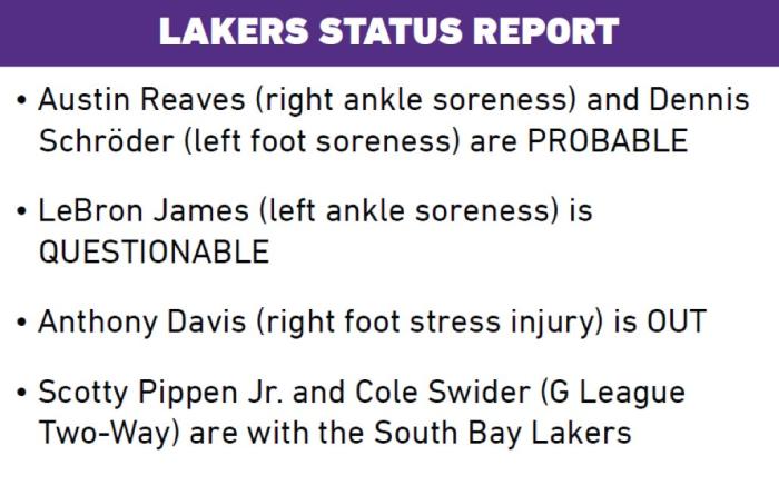 24直播网12月29日讯 湖人客场背靠背对阵热火赛前,球队更新伤病报告,詹姆斯(左脚踝酸痛)出战成疑,最终确定出战;浓眉(右脚应力性损伤)继续缺席比赛,里夫斯(右脚踝酸痛)和施罗德(左脚酸痛)大概率出战,也都出战,小皮蓬和斯威德仍在发展联盟南湾湖人。