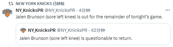 布伦森的伤势令人担忧,接受检查后,尼克斯官方表示,布伦森左膝酸疼,本场比赛回归成疑,之后纽约进一步宣布,布伦森因伤退出本场比赛;伤退前,布伦森上场43秒,开场第一个回合就受伤;赛季至今,布伦森已经出战了57场比赛,场均上场36分钟,能够拿到27.2分3.7篮板6.6助攻。