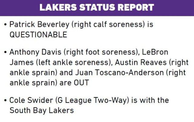 湖人险胜奇才一战,詹姆斯打了36分钟,轰下33分7篮板9助攻,背靠背的第二场,湖人让这位有伤在身的老将休息一场,也是非常正常的。浓眉此前就报道要伤停至少一个月,所以他也会继续缺阵