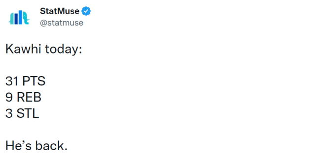 赛后接受采访谈到胜利,小卡只是“面瘫式”地说了一句:“今晚对我们来说是一场很棒的胜利!”这样的回答,真的非常小卡。美媒晒出小卡的数据,并感慨道:“他回来了!” 小卡出战时快船85胜34负,缺阵时70胜68负。