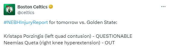 凯尔特人官方更新明天对阵勇士的伤情,波尔津吉斯因左四头肌挫伤被列为出战成疑,内米亚斯-奎塔因右膝伤势缺席比赛。