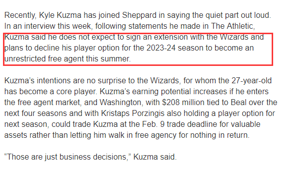 本周接受采访时,库兹马表示他预计不会和奇才提前续约,计划放弃23-24赛季的球员选项从而成为不受限制自由球员试水自由市场。
