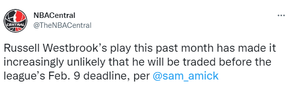 TA记者Sam Amick更新了湖人目前对待威少的态度,拉塞尔-威斯布鲁克过去一个月的表现让他被交易的可能性越来越小。Sam Amick表示:威少与湖人队的契合度依旧是一个问题。自10月28日以来,他作为第六人的数据虽然眼花缭乱,但当他下场时湖人的净效率值(+4.6)比他在场时(-3.4)还要高。威少也是湖人队前7名轮换球员中正负值最低的。但是,湖人队表现不佳的日子似乎要结束了,这使得湖人管理层对于(威少交易一事)转移了重心。