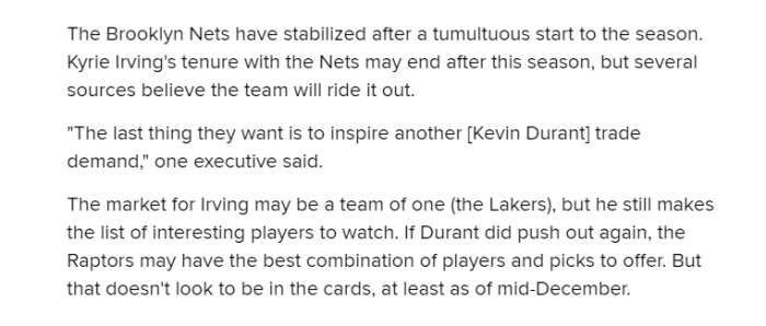 Eric Pincus表示,如果欧文被摆上货架,目前市场中对其有意的可能只有湖人;如果杜兰特再次申请交易,猛龙可以给出最好的球员+选秀权报价,但这两笔交易都不太可能在12月中旬发生。