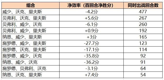 威少、沃克和里夫斯在场477个回合,百回合输4.2分