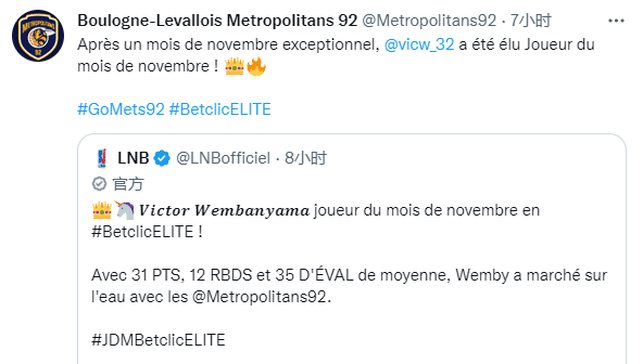 来源:24直播网12-09 10:0424直播网12月09日,LNB官方公布月最佳球员,巴黎大都会92队球员文班亚马当选11月份法甲篮球联赛月最佳球员,马刺球迷希望球队能够得到他。