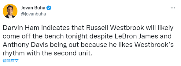 湖人多名主力休战,威少仍旧替补出战,赛前湖人主帅哈姆解释道:尽管多人缺阵,威少大概率还是会替补出场,因为我喜欢他在第二阵容中的节奏。