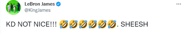 詹姆斯发推调侃杜兰特的疯狂表现:KD,你这样子可不好哦!嘘嘘嘘(笑哭表情)