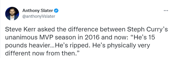 勇士对阵爵士赛前,勇士主帅接受采访,谈到库里2016年全票获得MVP时与现在的区别时,科尔说道:他现在比那时候重了15磅(6.8kg),很精壮。他现在的身体状况与那时候截然不同。