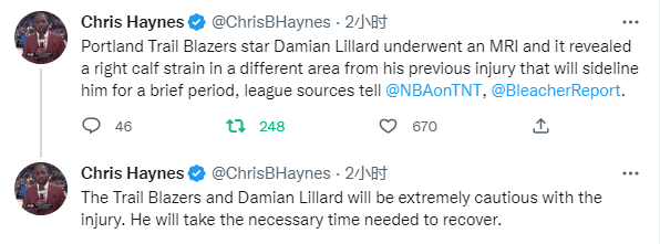 来源:24直播网11-21 16:0324直播网11月21日,利拉德的检查结果曝光,据名记Chris Haynes报道,利拉德接受核磁共振检查,伤情确诊为右小腿拉伤,这与之前受伤的部位不同,他将缺席近期的比赛。