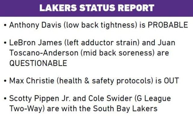 24直播网11月20日湖人官方公布了最新的伤病报告,詹姆斯(左内收肌拉伤)和托斯卡诺-安德森(背部酸痛)的状态同为出战成疑(questionable,50%上场可能),浓眉(腰部紧张)的状态是大概率出战(probable,75%上场可能)。克里斯蒂触发健康安全协议,继续休战。小皮蓬和斯维德仍在G联赛的南湾湖人效力。
