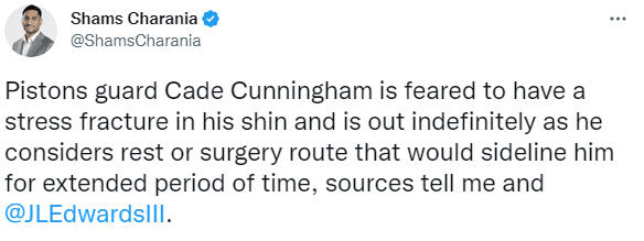 Jeff Stotts跟进报道,如果坎宁安接受手术,这将可能导致其赛季报销,接受胫骨应力性伤势的手术,平均缺席61场比赛,包括霍勒迪、赛斯-库里在内的多名球员曾在赛季过程中接受过相关手术,但只有麦格鲁德在同一赛季回归,当时他是在10月份接受手术,并在缺席了60场后时隔139天完成了复出。