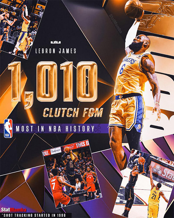 5、詹姆斯关键时刻进球达到1010球,NBA历史最多