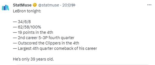 NBA洛城德比备受关注,湖人第二节被快船拉开分差,第三节最多落后21分,三节打完湖人落后19分,在这样的困境下,39岁的詹姆斯开启全力詹模式,末节12中6独砍19分带领紫金军团扭转局面,关键时刻,詹姆斯助攻雷迪什杀死比赛。