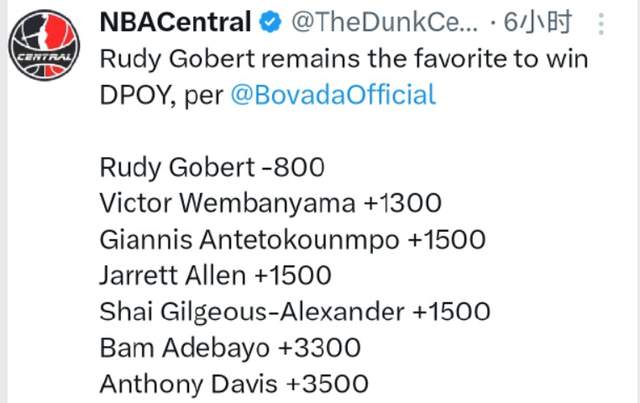 从数据来看,如果给戈贝尔投800,那么他当选DPOY之后得到的回报只有900。从投入产出比来看,这证明戈贝尔当选几乎已经板上钉钉。而排名第二的文班亚马,投入100得到的回报则是疯狂的1400。两人的差距如此之大,也预示着本赛季NBA的年度最佳防守球员奖项已经失去了悬念。