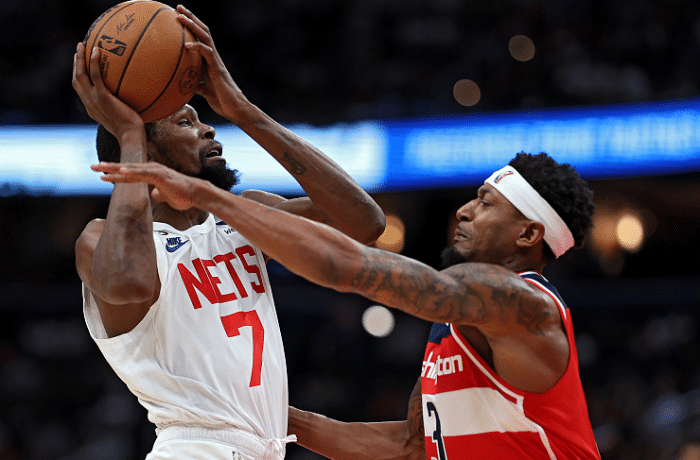 末节杜兰特早早上场,篮网领先到30分以上,比赛早早沦为垃圾时间,比赛还剩7分43秒,杜兰特提前打卡下班,坐在替补席观战;最终篮网客场大胜奇才,开赛至今3胜6负,也是纳什下课后篮网首胜。