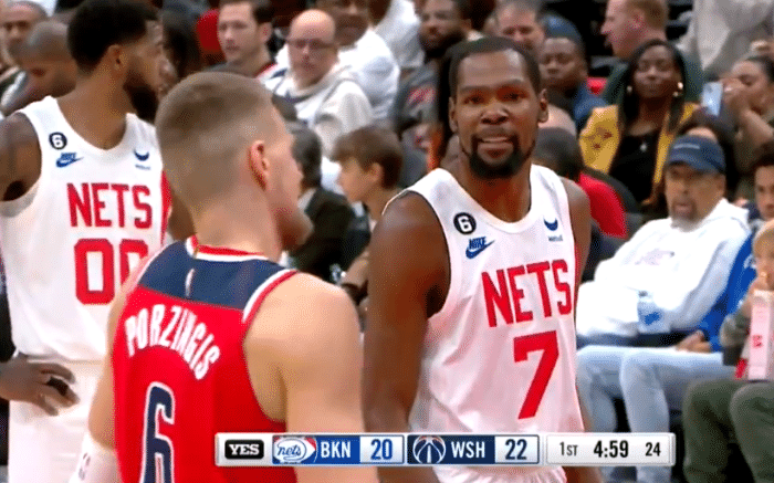 值得一提的是,杜兰特罚球时和波尔津吉斯发生口角,两人互喷了几句。