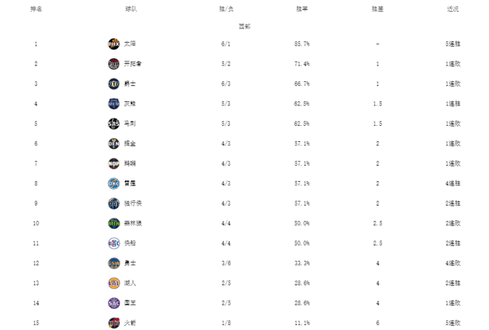勇士本赛季一共打了5个客场比赛,全部输球,球队目前的战绩为3胜6负,落后榜首的太阳4个胜场,位居西部第12名,仅仅领先本赛季同样表现不佳的湖人、重建中的国王和火箭。