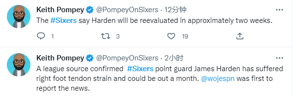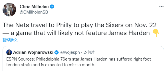 对于哈登伤情,ESPN名记沃纳罗斯基报道,哈登因右脚肌腱拉伤,预计至少缺席一个月的比赛,篮网记者Chris Milholen表示篮网将于11月23负前往费城对阵76人,哈登很有可能无缘对阵前东家。