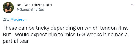 哈登带伤出战仍不敌奇才,检查之后伤情确诊为右脚肌腱拉伤,76人官方表示哈登至少伤停两周,可外界报道他至少伤停1个月;医学专家 Evan Jeffries表示,哈登可能遭遇肌腱二级拉伤,可能缺席6-8周;肌腱的伤病很棘手,何时复出取决于他的肌腱。