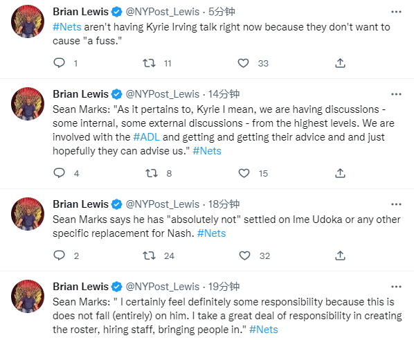 篮网总经理还谈到欧文的情况,透露欧文今晚不会接受媒体采访,因为球队现在不想引起更多的骚动;篮网正在进行一些内部讨论并且听取外界的一些建议。