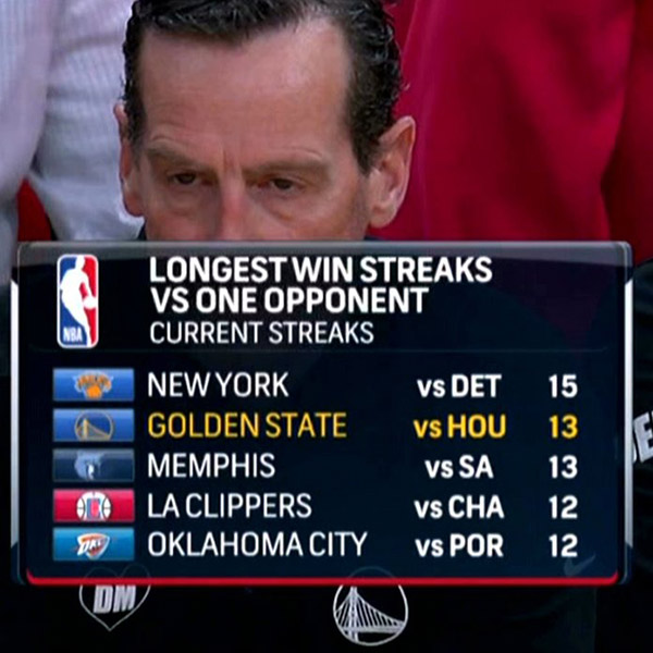 勇士常规赛面对火箭豪取13连胜,现存并列第二长,仅次于尼克斯对活塞的15连胜;勇士豪取6连胜,为当今联盟现存最长的连胜纪录。
