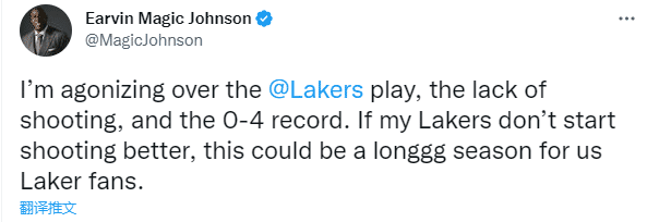 开赛至今,湖人4连败全输了,对于湖人现状,魔术师表示:我正在为湖人的表现、缺乏投射和0胜4负的战绩而苦恼;如果我的湖人没法改善投篮,那这个赛季对我们这些湖人球迷来说可能又会是漫长的一年。